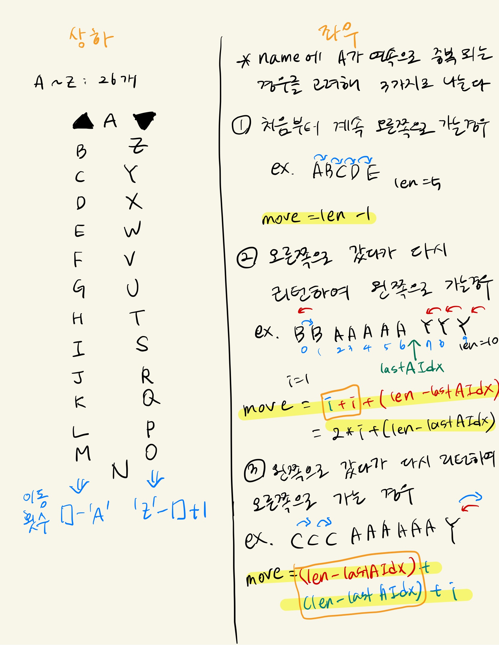 문제 링크 https://programmers.co.kr/learn/courses/30/lessons/42860 코딩테스트 연습 - 조이스틱 조이스틱으로 알파벳 이름을 완성하세요. 맨 처음엔 A로만 이루어져 있습니다. ex) 완성해야 하는 이름이 세 글