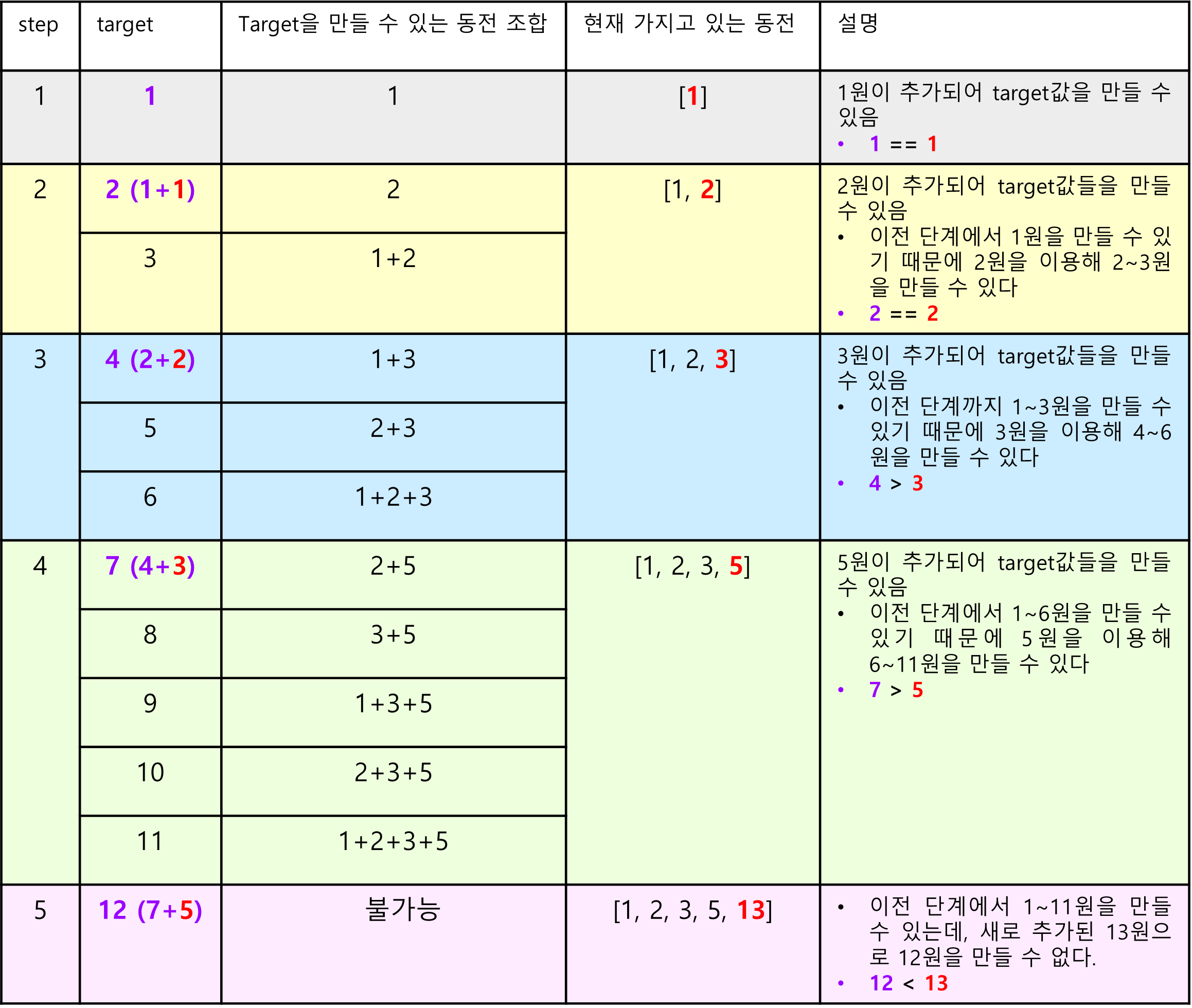단계 4에서도 위 설명과 동일하게 11원까지 만들 수 있다는 것이 확인되고, 단계 5에서는 확인하는 초기 target값 12가 추가된 동전 금액 13보다 작기 때문에 12원은 만들 수 없게 된다.