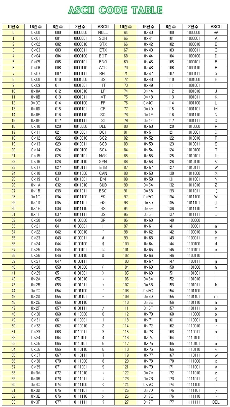 아스키코드란? 컴퓨터는 0과 1 숫자 밖에 모르기 때문에 문자도 숫자로 기억합니다. 이때, 어떤 숫...