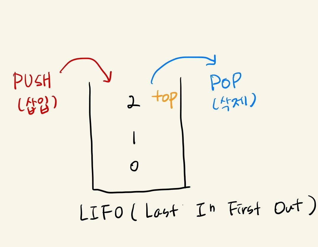 - 자료는 top이 가리키는 가장 맨 위에 쌓이며, 자료를 삭제할 때도 top을 통해서만 삭제가 가능하다.