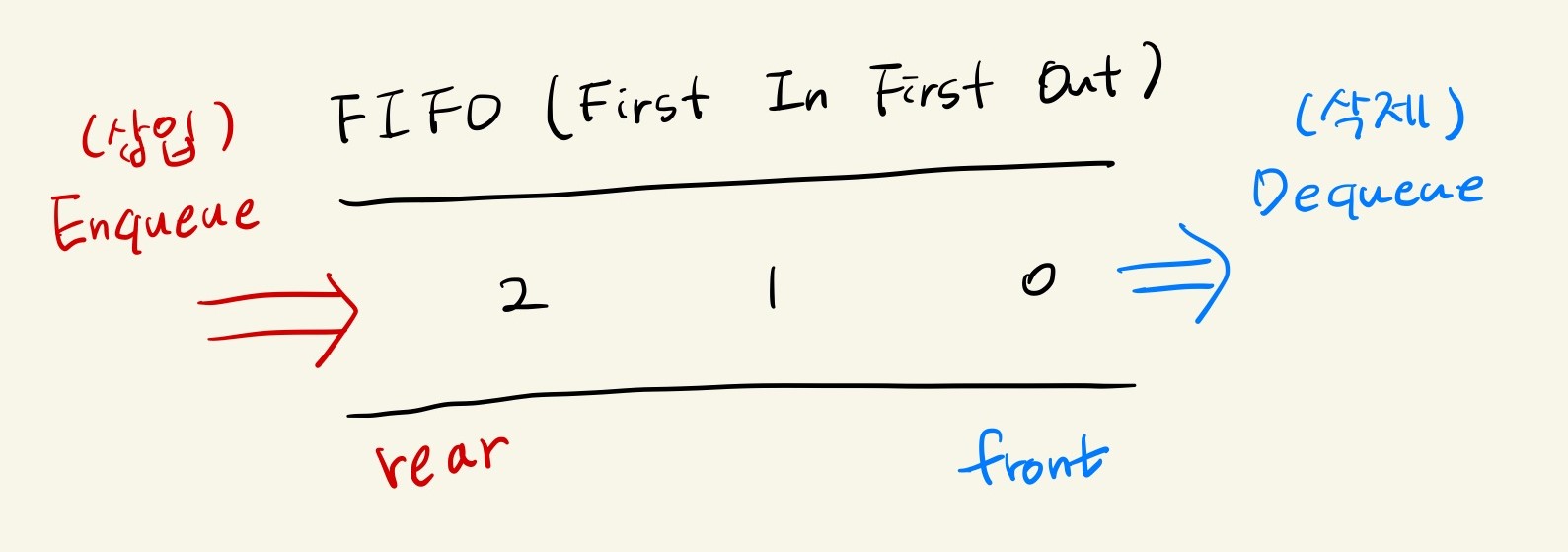- 삽입 연산이 이루어지는 곳을 리어(rear), 삭제 연산이 이루어지는 곳을 front라고 부른다.