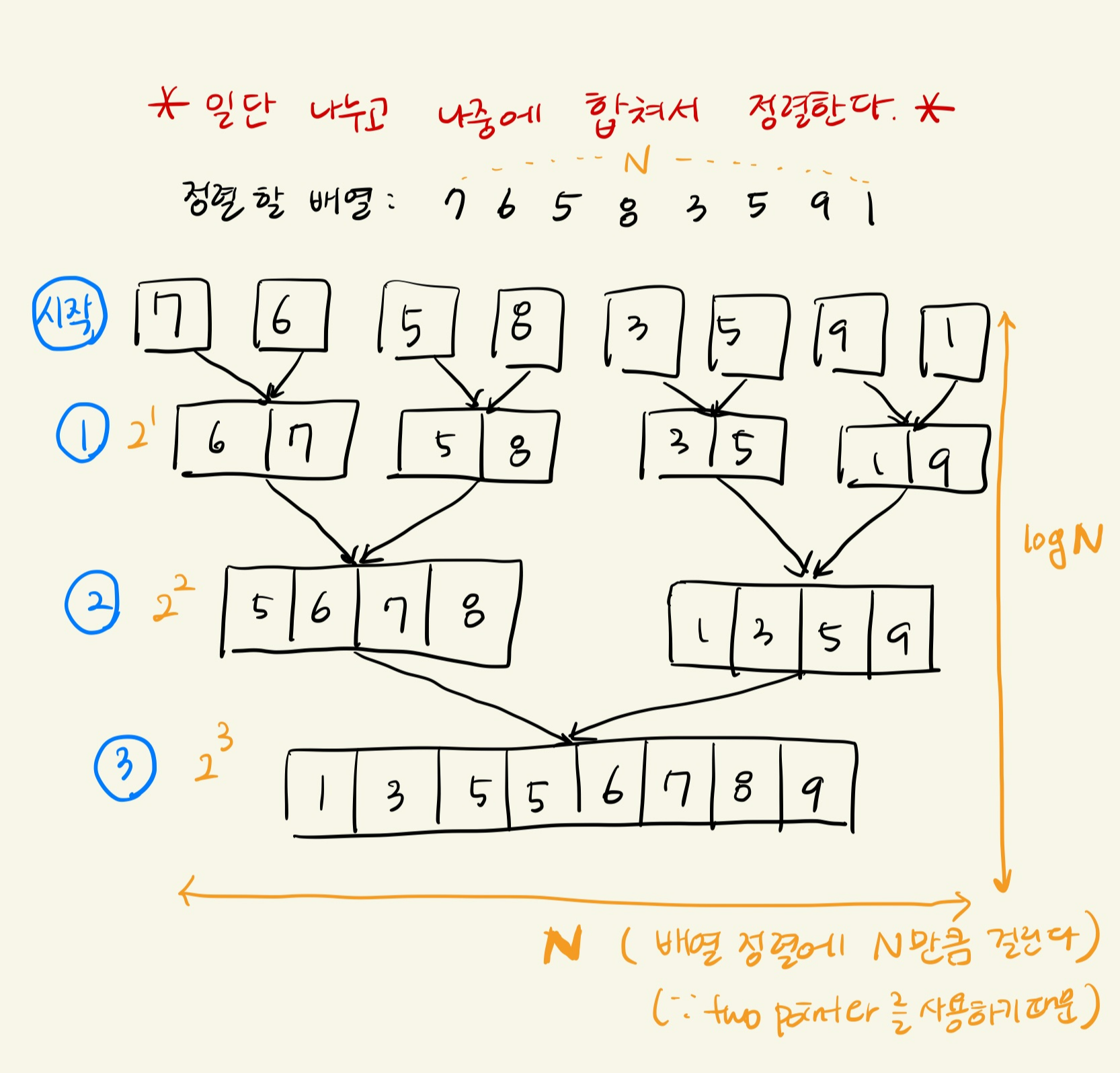 합치는 개수는 2배씩 증가하므로 2^3 = 8 로 3단계가 필요하다. 따라서 단계의 크기는 데이터의 갯수가 N개일 때 logN을 유지하게 된다.