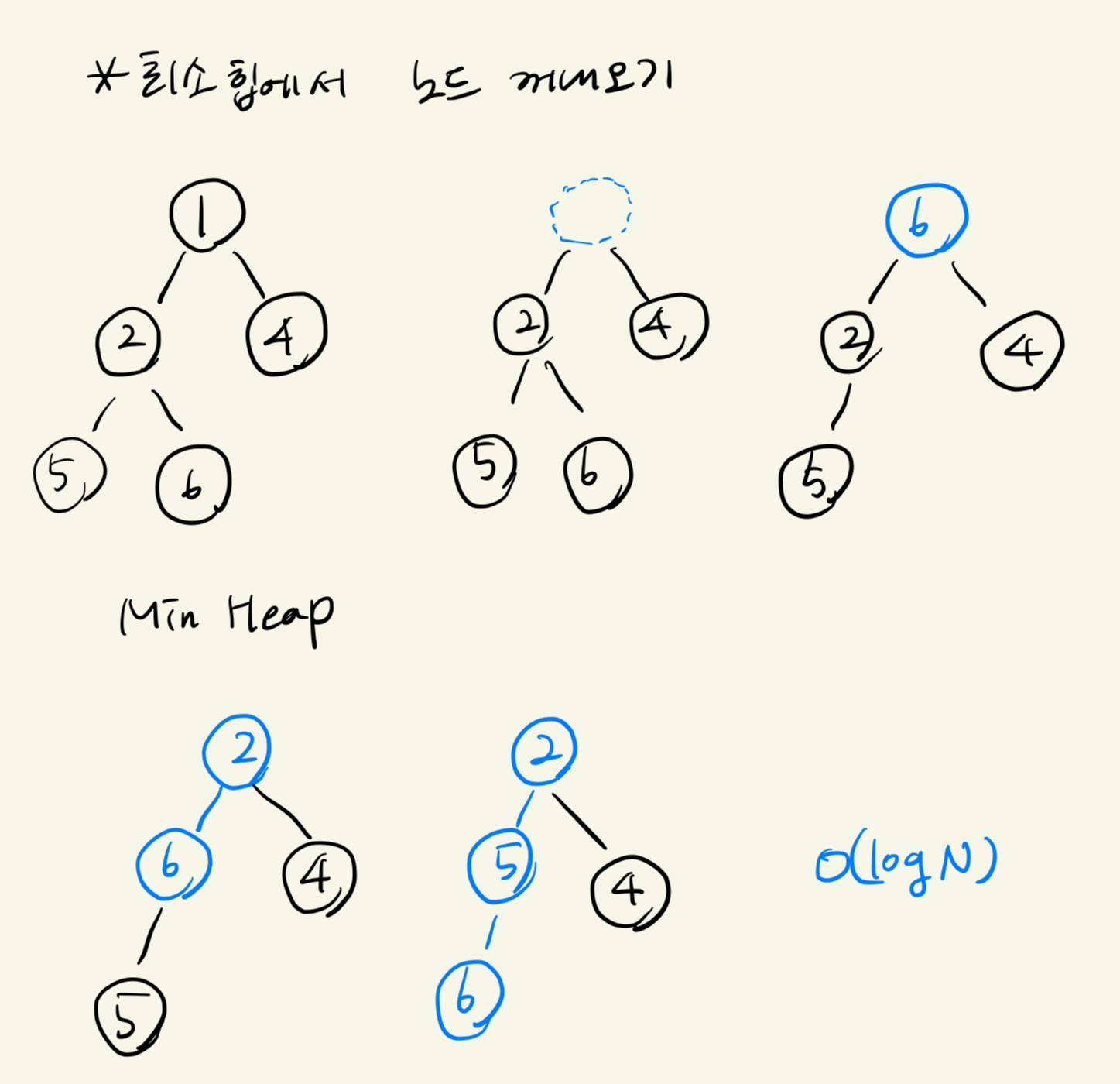 자신의 자식노드와 비교해서 더 작은 값을 올린다. (자식이 자기보다 크거나 마지막 노드에 갈때 까지 반복한다.)