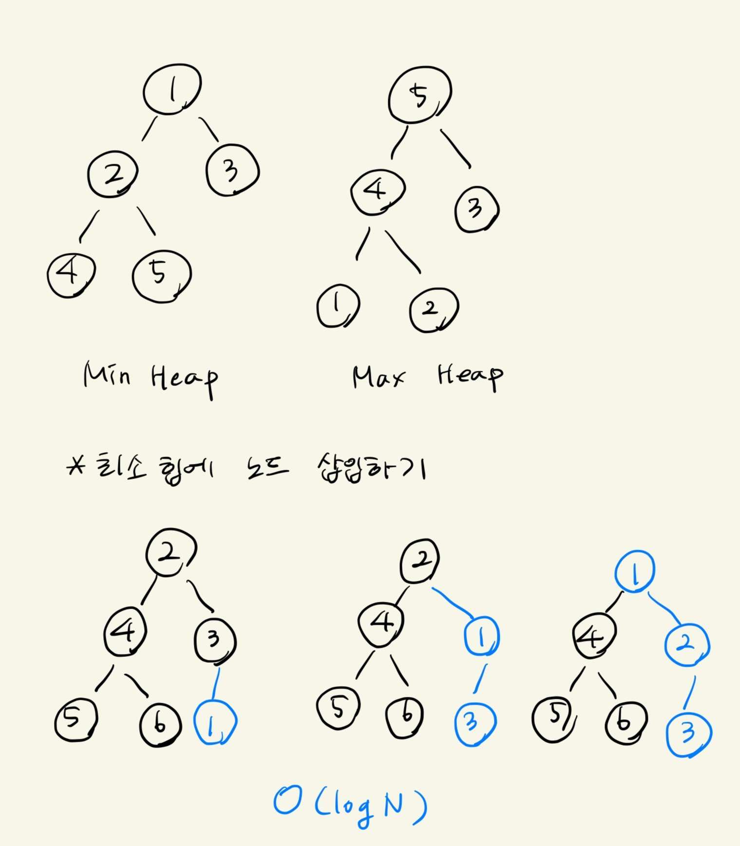 정렬을 위해 자신과 부모노드를 비교해서 자신의 값이 작으면 자리 교환 (노드가 root에 도착했거나 부모노드가 자신보다 작을 때까지 반복)