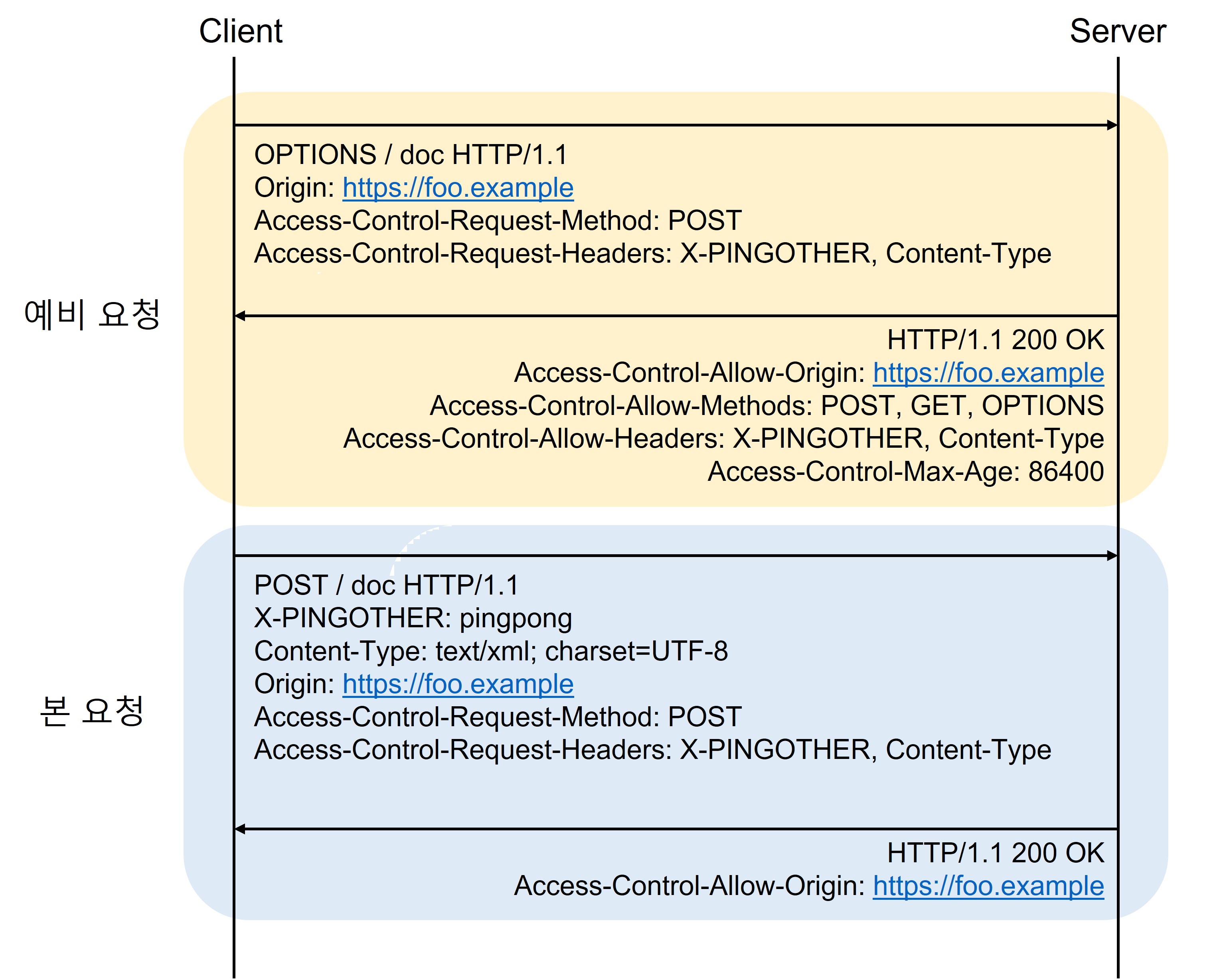 - 브라우저는 클라이언트에서 보낸 Access-Control-Request정보들(클라이언트에서 보낸 요청), Origin과 서버의 Access-Control-Allow 정보들(서버가 응답해준 정책)을 비교하여 해당 요청이 안전한지 확인하고 본 요청을 보낸다.